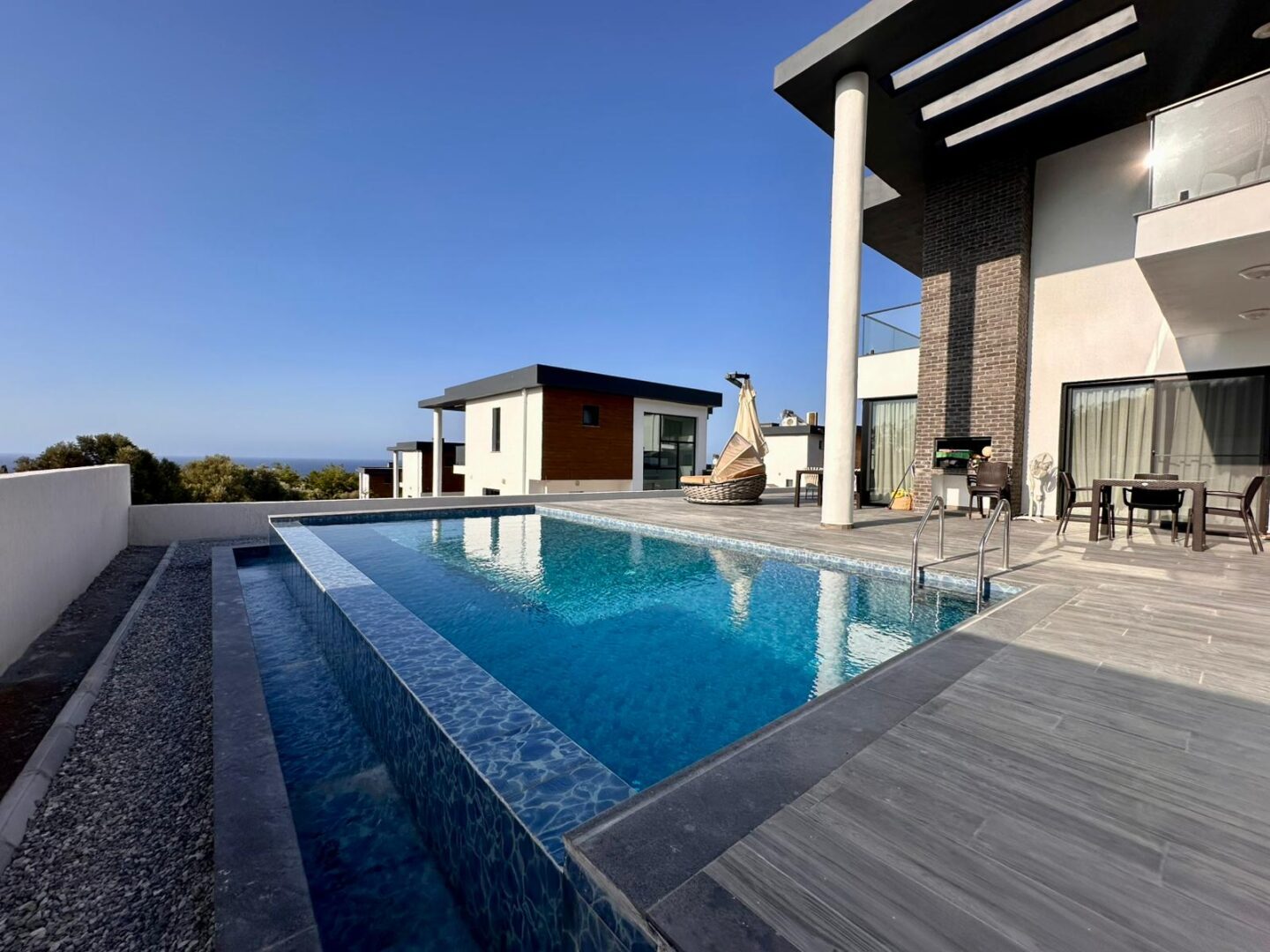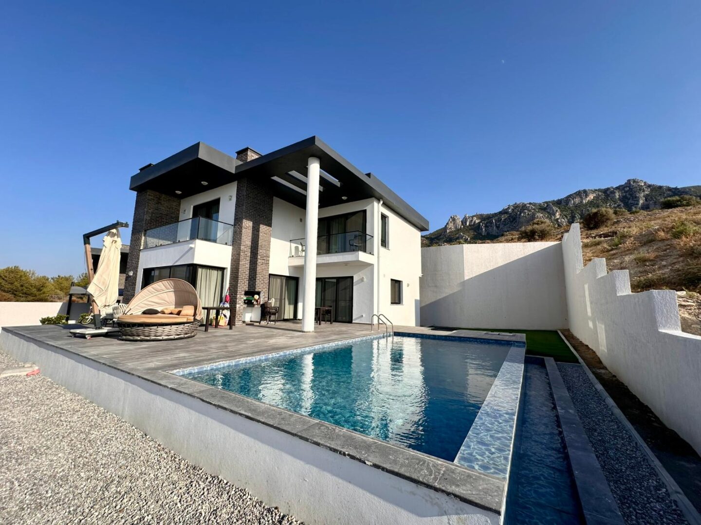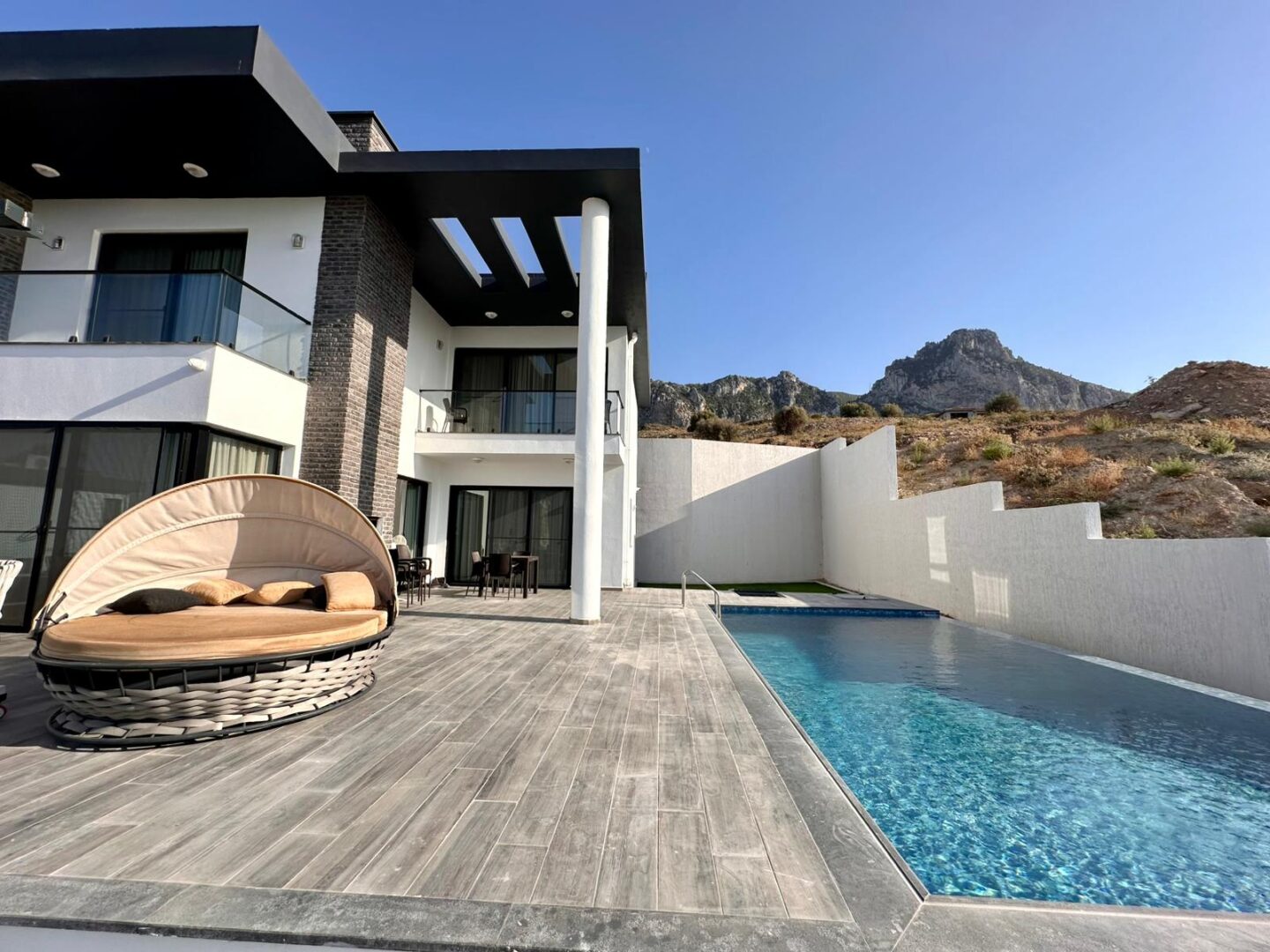 Your dream villa in Kyrenia — from the “Million-Dollar Villas” collection. This is not just a house, but a harmonious blend of thoughtful architecture, premium materials, and breathtaking panoramas. The total area is 230 m², with every square meter designed for your comfort. The property offers 4 spacious bedrooms, including a master suite with a private walk-in closet and en-suite bathroom, 3 elegant bathrooms (one with both a bathtub and shower, two with modern walk-in showers), a separate laundry room, and an additional walk-in closet for convenient storage. A large terrace and two balconies open to captivating views of the sea and mountains, while the foundation and basement waterproofing ensure durability for many years to come. A heat pump with underfloor water heating on the first floor and radiators on the second, inverter air conditioners in every room, and heated towel rails in the bathrooms provide comfort all year round. For relaxation, there is a 7×4 m swimming pool. The villa is equipped with premium Bosch appliances: two refrigerators, a wine cabinet, dishwasher, built-in coffee machine, microwave, oven, washing machine, and dryer. The kitchen and bathrooms feature Laminam ceramic granite from Italy, while the sanitary fittings are by Steinberg and Grohe. A carport is also included. The home is located in a prestigious area of Kyrenia, offering both privacy and magnificent views of the sea and mountains. Sold fully turnkey — all you need to do is add your personal touch to the interior. Contact us today to learn more about the price and purchase conditions.